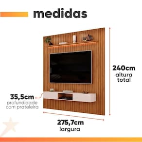 Importante sobre a : A é realizada até a portaria ou porta de entrada do indicado, desde que o acesso seja permitido. Para locais com portaria, a será feita no piso térreo. Não realizamos montagem, desmontagem, por escadas ou içamento. É responsabilidade do cliente verificar se as dimensões do produto são compatíveis com portas, elevadores e corredores. Evite imprevistos: confira todos os detalhes antes de concluir sua compra. MEDIDAS PAINEL:: A = 240 cm L = 275,7 cm P = 35,5 cm | MEDIDAS PRATELEIRA PAINEL:: A = 2,5 cm L = 240 cm P = 15 cm | MEDIDAS NICHO:: A = 21,2 cm L = 210 cm P = 31 cm | PESO SUPORTADO PAINEL:: 40 kg | PESO SUPORTADO NICHO:: 30 kg | PESO PAINEL:: 88,35 kg | MODELO:: Painel Para TV Até 90 Polegadas 2,75m Ripado Autêntico Com Led e Nicho Montreal | MARCA:: DJ Móveis | COR:: Madeirado/Off White | PINTURA:: UV de alta qualidade, 8 camadas | ACABAMENTO:: Melamina e PVC | PRATELEIRA PAINEL SUPORTA ATÉ:: 5 kg | PESO NICHO:: 19,90 kg | IDEAL PARA TV DE ATÉ:: 90 Polegadas | MATERIAL:: MDP/MDF | ESPESSURA DO MATERIAL DA ESTRUTURA:: 12 mm e 15 mm | PRATELEIRAS PAINEL:: 1 | PORTAS NICHO:: 2 | TIPO DE PORTA:: Basculante | PUXADOR:: Cava | ESPAÇO PARA PASSAR FIOS:: Sim | DIFERENCIAIS:: Design moderno e sofisticado / Pintura UV de alta qualidade, 8 camadas / Espaço para aparelhos eletrônicos / Nicho com 2 portas basculantes para melhor armazenamento / Painel com ripado autêntico / Prateleira superior extensa com Led / Suportam TV de até | INSTRUÇÕES E CUIDADOS:: Para maior durabilidade, recomendável que a limpeza dos móveis seja feita com pano limpo e seco. Não usar produtos químicos ou abrasivos. | GARANTIA:: 3 meses pelo fabricante. | AVISO:: Importante sobre a : A é realizada até a portaria ou porta de entrada do indicado, desde que o acesso seja permitido. Para locais com portaria, a será feita no piso térreo. | Altura: 240 cm | Formato do móvel: Painel | Inclui manual de montagem: Sim | Largura: 275,7 cm | Profundidade: 35,5 cm | Quantidade de caixas de embalagem: 2 | Requer montagem: Sim | Altura da embalagem: 36 cm | Comprimento da embalagem: 256 cm | Largura da embalagem: 57 cm | Peso da embalagem: 112200 g | Tipo da embalagem: sem embalagem adicional | Cor: Madeirado/Off White