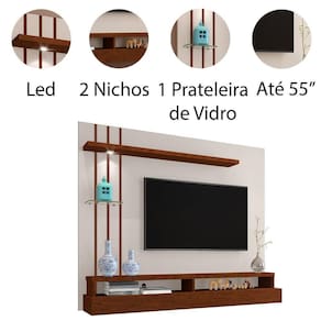 Produzido em mdp de alta qualidade, este painel combina resistência, beleza e funcionalidade. Sua estrutura utiliza peças de 15 mm, além de prateleira superior de 25 mm, prateleira inferior de 30 mm e uma prateleira de vidro que acrescenta elegância ao design. A iluminação led integrada cria um efeito moderno e acolhedor, destacando objetos decorativos e valorizando o ambiente. Com dois nichos e duas prateleiras, o móvel oferece organização prática para eletrônicos, controles e acessórios do dia a dia. O acabamento em pintura uv garante proteção, brilho e maior durabilidade. Por ser suspenso, o painel otimiza o espaço, deixa o ambiente mais clean e acomoda TVs de até 55 polegadas com estilo, eficiência e praticidade.