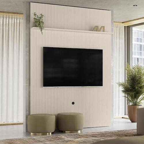 O Painel Piso-Teto New Interlagos possui um design moderno em MDF frisado (baixo relevo) e estrutura em MDP e MDF de 12 e 25mm, este painel suporta TVs de até 75 e foi projetado para ser fixado diretamente na parede, garantindo praticidade e um visual clean. Ideal para quem busca aliar sofisticação e organização no ambiente.