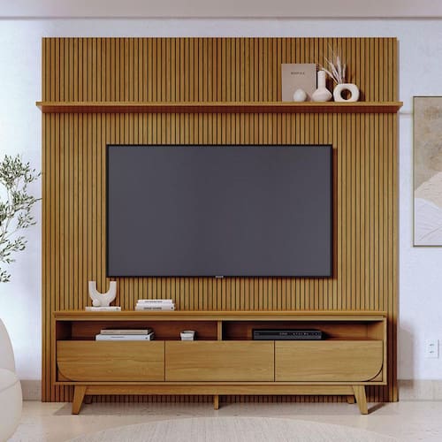 Painel Piso Teto New Guaporé com Rack Bancada Selene New Luna Ambiente Cumaru - Madetec