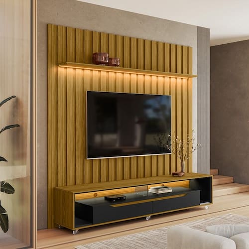 O Painel Ripado London 177cm é um produto com um design no estilo ripado. A sua estrutura é em MDF e MDP de 15 e 25 mm, possui uma prateleira superior de 25mm onde apresenta um led com luz quente deixando Painel iluminado e um passa fio para TV.