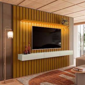 Que tal o Rack com Painel Ripado Guadalupe? Nada como um conjunto de rack com painel para deixar sua sala de TV com aquele ar moderno e bem finalizado, né? No modelo Guadalupe, além da funcionalidade para receber a TV de até 70 polegadas e outros objetos do dia a dia, você também encontra um design sofisticado que utiliza o ripado, elemento atual que deixará sua casa digna de todos os elogios. Ah, a tonalidade atemporal somada ao acabamento amadeirado ainda são fáceis de combinar com tudo, desde o sofá até o tapete e mesinhas laterais. Tudo de bom para seu doce lar! Marca: Modern