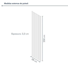Modulares, com dimensões de 58 cm de largura, 250 cm de altura e 3,3 cm de espessura, os painéis possuem passagem interna para cabos, proporcionando um acabamento funcional e elegante.