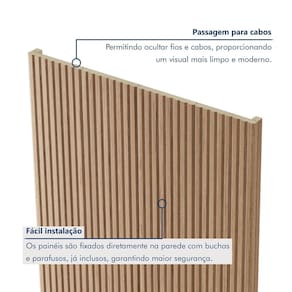 A instalação é simples e prática, sem necessidade de colas. Os painéis são fixados diretamente na parede através de réguas com parafusos e buchas, todos incluídos.