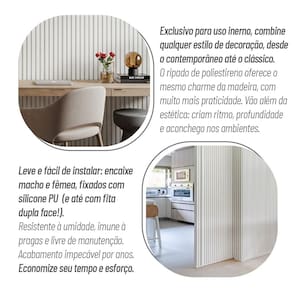 Com uma variedade de acabamentos e núcleos, nossos ripados se adaptam perfeitamente a qualquer estilo de decoração, desde o contemporâneo até o clássico. Leves e de fácil aplicação , nossos ripados garantem uma instalação rápida (encaixe macho e fêmea - fixados com silicone PU) e sem complicações, economizando seu tempo e esforço. Feitos de poliestireno de alta qualidade , são resistentes ao desgaste, à umidade e facilidade de limpeza , mantendo a beleza e integridade do seu ambiente por muito mais tempo.