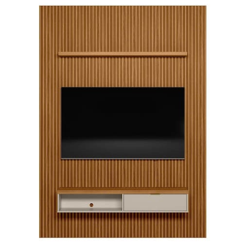 O ripado por si só já garante o charme que você procura, mas quando combinado com a prateleira e o módulo de rack suspenso a decoração fica completa, pois além de agregar beleza, ainda traz funcionalidade, já que você pode dispor de itens decorativos, como também instalar outros aparelhos eletrônicos no nicho da bancada; ao passo que pode aproveitar o compartimento interno da porta basculante para guardar objetos que costumam ficar espalhados sobre o tampo e, assim, manter a organização do ambiente. Demais não é mesmo?
