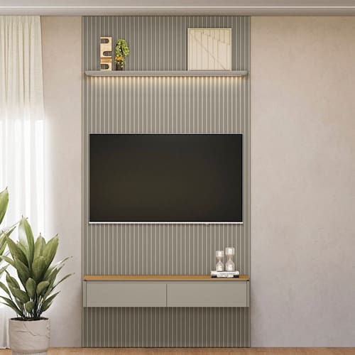 Painel Ripado para TV até 60 Polegadas com LED 2 Portas Modular 1.4 Linea Brasil. Com um design clean que valoriza a decoração, ele conta com uma prateleira de cantos arredondados com iluminação em LED, que traz um toque sofisticado ao espaço. O nicho com cantos arredondados acomoda perfeitamente os aparelhos eletrônicos, enquanto as duas portas basculantes com pistão a gás garantem funcionalidade e um visual refinado. Uma combinação perfeita de funcionalidade e estilo para deixar sua sala ainda mais bonita e contemporânea.