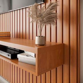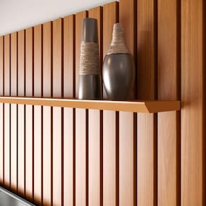 Cor: Cedro | Fabricante: EDN | Produto: Painel | Altura: 240cm | Largura: 229cm | Cômodo Indicado: Sala de Estar | Material da Estrutura: MDP | Suporta TV até: 75 Polegadas | Número de Portas: Não Possui | Possui Nichos: Sim | Possui Gavetas: Não | Possui Portas: Não | Acabamento: Ripado Cor: Cedro