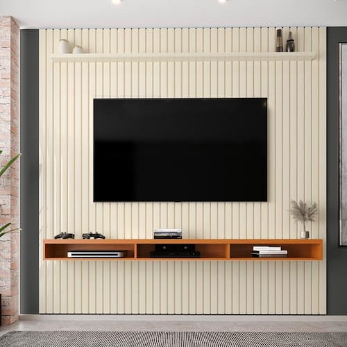 Sua estrutura em MDP confere durabilidade e estabilidade, garantindo que seu televisor esteja seguro e bem acomodado. Projetado para TV de até 75 Polegadas, este painel combina funcionalidade e estilo de forma única com seu design premium. Além disso, conta com prateleiras espaçosa, perfeita para acomodar seus dispositivos eletrônicos, acessórios e itens decorativos. Suas bordas laqueadas traz um acabamento sofisticado, realçando ainda mais o charme deste painel. O nicho é um componente extremamente versátil que vem para agregar a composição junto com o painel. O Painel Intense irá adicionar um toque especial ao seu espaço. Seu acabamento ripado proporciona um visual moderno e contemporâneo, trazendo uma textura única e refinada para a sua sala.