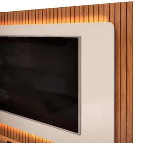 Painel posterior ripado e painel central com cantos arredondados e fita de LED.
