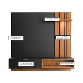 O destaque do Painel Tocantins está no elegante ripado lateral, composto por prateleira e iluminação de LED. Além de seu design charmoso, o painel é altamente funcional, oferecendo capacidade para TVs de até 60 polegadas fixadas com segurança. Completa o conjunto uma porta basculante, adicionando um toque de refinamento ao ambiente. O Painel Tocantins não apenas embeleza sua sala, mas também proporciona praticidade e estilo no seu dia a dia. CARACTERÍSTICAS TÉCNICAS: - Produzido em MDP de 15 e 25mm - Acabamento Fosco com Pintura UV - Porta Basculante com Dobradiça Metálica - Puxador Perfil Aba em metal na cor Dourado - Detalhe Ripado - Spot de Led Bivolt - Peso Suportado no Painel de 30kg - Peso Suportado na Prateleira de 2kg - Ideal para TV até 60 Polegadas - Necessita de Fixação na Parede - NÃO Acompanha Suporte para TV - Possui 1 Porta, 1 Prateleira e 1 Nicho INFORMAÇÕES TÉCNICAS: Altura: 156 cm Largura: 160 cm Profundidade: 32,8 cm Peso: 56,80 kg ITENS INCLUSO: - Painel Tocantins - Manual de Montagem - Kit de Ferragens INFORMAÇÕES ADICIONAIS: - Não realizamos a montagem do móvel e não nos responsabilizamos por ela. Verifique o produto antes de montá-lo. Produtos danificados na montagem não serão trocados. Montagem e instalação são por conta do comprador. - As imagens decorativas são ilustrativas e podem conter itens não inclusos. As cores do produto podem variar conforme o monitor, iluminação ou percepção visual. - Limpeza: Use um pano macio e seco ou levemente umedecido com água. Não utilize materiais abrasivos como palha de aço ou objetos cortantes. Garantia de 3 meses contra defeitos de fabricação conforme o Código de Defesa do Consumidor. Ean: 7899568245694