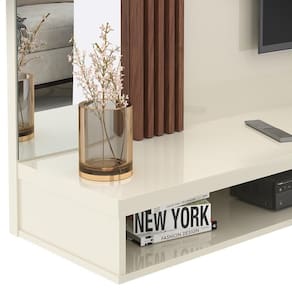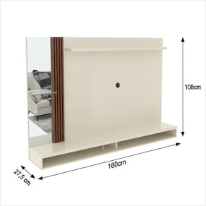 Ambiente Principal: Sala de Estar | Largura: 160 cm | Complexidade da Montagem: Média | Pessoas necessárias para montagem: 1 | Altura: 108 cm | Profundidade: 27,5 cm | Suporta até: 30 kg | Possui iluminação Não | Medida máxima para TV: 55 polegadas | Origem do produto Nacional | Necessita montagem: Sim | Possui portas: Não Possui Portas | Possui gavetas: Não Possui Gavetas | Quantidade de caixas de embalagem: 1 | Possui prateleiras?: Possui 2 prateleiras | Possui nichos?: Possui 2 nichos | Possui espelhos?: Possui 2 espelhos | Possui vidro?: Possui 1 prateleira de vidro | Modelo Sarabi; Estante; Painel; Sala de Estar; Quarto; Royal; | Marca: ViaNossa; ViaNossa Móveis; EDN Móveis; Sarabi; Royal | Material: MDP e MDF | Formato do móvel: Painel | Acabamento Pintura UV | Tempo de garantia: 3 meses | Tipo de garantia: Fabricante | Inclui manual de montagem: Sim Off White e Naturale