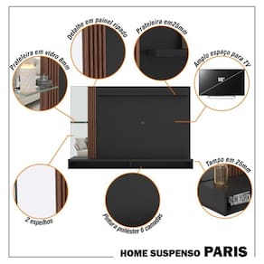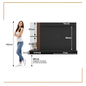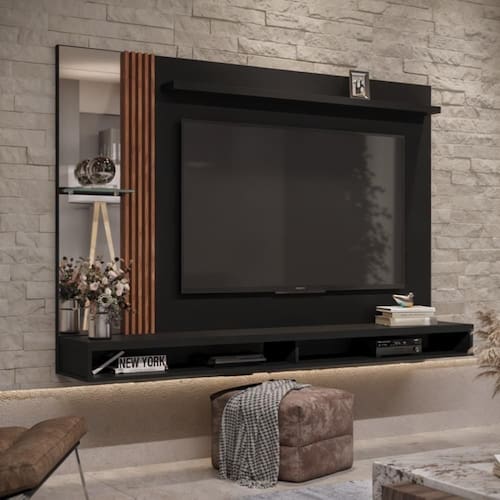 Ambiente Principal: Sala de Estar | Largura: 160 cm | Complexidade da Montagem: Média | Pessoas necessárias para montagem: 1 | Altura: 108 cm | Profundidade: 27,5 cm | Suporta até: 30 kg | Possui iluminação Não | Medida máxima para TV: 55 polegadas | Origem do produto Nacional | Necessita montagem: Sim | Possui portas: Não Possui Portas | Possui gavetas: Não Possui Gavetas | Quantidade de caixas de embalagem: 1 | Possui prateleiras?: Possui 2 prateleiras | Possui nichos?: Possui 2 nichos | Possui espelhos?: Possui 2 espelhos | Possui vidro?: Possui 1 prateleira de vidro | Modelo Sarabi; Estante; Painel; Sala de Estar; Quarto; Royal; | Marca: ViaNossa; ViaNossa Móveis; EDN Móveis; Sarabi; Royal | Material: MDP e MDF | Formato do móvel: Painel | Acabamento Pintura UV | Tempo de garantia: 3 meses | Tipo de garantia: Fabricante | Inclui manual de montagem: Sim Preto e Naturale