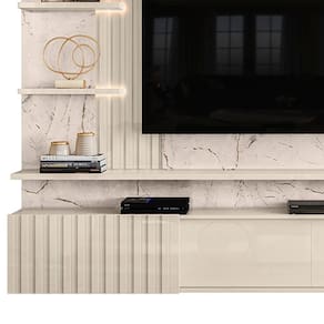 Painel Suspenso Atena, com visual moderno inspirado em mármore e composição rica em detalhes ripados. Estrutura em MDP 15/25 mm (base 15 mm e prateleira/tampo 25 mm), ideal para TVs de até 65 polegadas (suporta até 57 kg). Conta com 3 portas de correr com sistema de abertura por trilho plástico, sendo uma delas com detalhes em ripado vertical, o mesmo detalhe aplicado à lateral do painel. Possui 2 prateleiras laterais com fitas de LED integradas e passa fios central. Acabamento em pintura UV texturizada (fosca e brilho). Este móvel chegará em sua casa separado em 02 volumes.