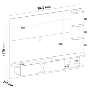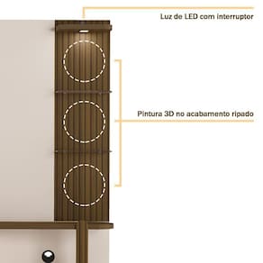 Características adicionais: Para para até 72 polegadas; Possui 2 passa fios; Acompanha suporte metálico para , 4 prateleiras de vidro temperado 6mm. Luz de LED com 2m de fio para ligar na tomada; 2 portas com dobradiças metálicas; Detalhes curvos de MDF 25mm e 15mm; Pintura 3D no acabamento ripado.