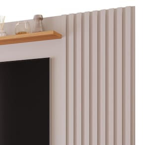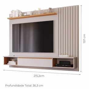 O Painel Suspenso Bahamas é um produto 100% MDF. Possui espaço para TV de até 65 e uma prateleira superior com 2,5cm de espessura para objetos decorativos. O destaque principal fica por conta do aplique ripado na cor do produto. O tampo é espesso com 2,5cm e tem borda chanfrada com acabamento em laca. Possui também nichos inferiores para equipamentos e uma porta basculante para auxiliar na organização da sua sala. A composição de cores traz o requinte do acabamento madeirado nos detalhes deixando prevalecer no produto as cores sólidas e neutras, assim ele pode combinar mais facilmente com qualquer estilo decorativo.