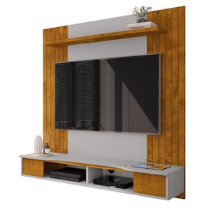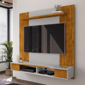 Com prateleiras de madeira elegantes e um design moderno, esta unidade não só acomoda sua TV de tela plana com estilo, mas também oferece espaço para exibir seus objetos decorativos e eletrônicos.