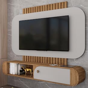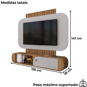 Painel Suspenso Jurerê, design orgânico e atual! Estrutura em MDP/MDF (12/15mm) com acabamento em pintura UV texturizada. Possui nicho central, porta basculante com dobradiças metálicas, puxador estilo Amalfi (plástico), passa fios, detalhes usinadas com bordas curvas e ripados decorativos (MDF 12 mm em baixo relevo). Suporta TVs de até 55 polegadas com segurança. Fixação por meio de parafusos. Este produto será entregue em 1 volume.