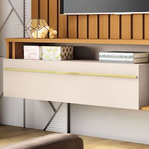 O Painel Suspenso Self é moderno e sofisticado, com o autêntico ripado HB Móveis. Possui também porta basculante com pistão a gás, puxador metálico em tom dourado, tampo e prateleira superior com espessura de 25mm e produzido em MDP e MDF. É perfeito para sua sala de estar ou até mesmo para o seu quarto. Complemente seu ambiente com bom gosto e qualidade! Especificações: