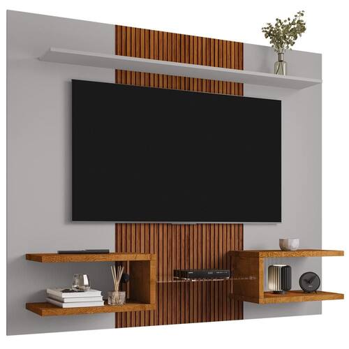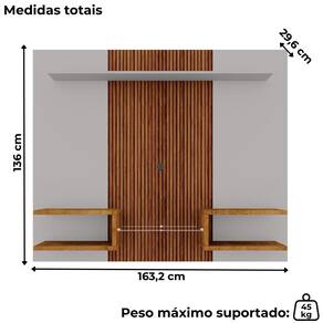 Painel Suspenso Atlas, modelo moderno alinhando estilo e funcionalidade! Estrutura em MDP (15/25mm) com acabamento em pintura UV texturizada. Possui nichos vazados laterais, prateleira central (vidro 6mm), prateleira superior (MDP 25mm) e detalhe de impressão 3D no MDP, imitando Ripado de madeira. Suporta Tvs de até 55 polegadas com segurança. Fixação por meio de parafusos. Este produto será entregue em 1 volume.