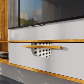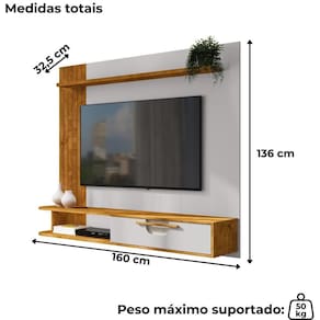 Painel Suspenso Jeri, design orgânico e funcional para um ambiente moderno e aconchegante. Estrutura em MDP (12/15mm) com acabamento em pintura UV texturizada. Possui porta basculante com dobradiças metálicas, prateleira superior (MDP 25mm), nicho vazado e frisados laterais decorativos (MDF 12mm em baixo relevo). Destaque para o aplique de Tela Sintética (PVC com poliéster). Suporta Tvs de até 65 polegadas com segurança. Fixação por meio de parafusos. Este produto será entregue em 1 volume.