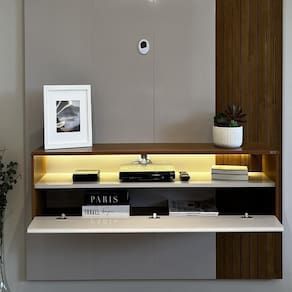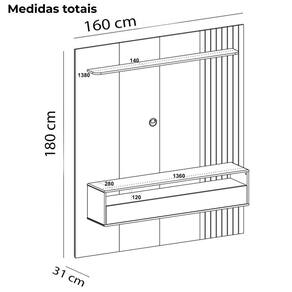 O Painel suspenso une elegância, modernidade e funcionalidade em um único produto. Feito para suportar com segurança televisores ultra widescreen de até 65 polegadas e widescreen de até 72 polegadas, com estrutura em MDF/MDP de 15mm, 1 nicho amplo com bordas arredondados e fita led, 1 prateleira com bordas arredondados, 1 porta basculante com pistão metálico e amortecedor, puxador chanfrado (estilo cava), detalhes ripados em baixo relevo, além de já acompanhar suporte para TV. Este móvel chegará em sua casa separado em 02 volume.