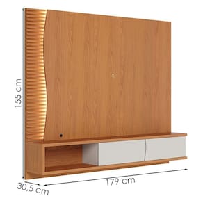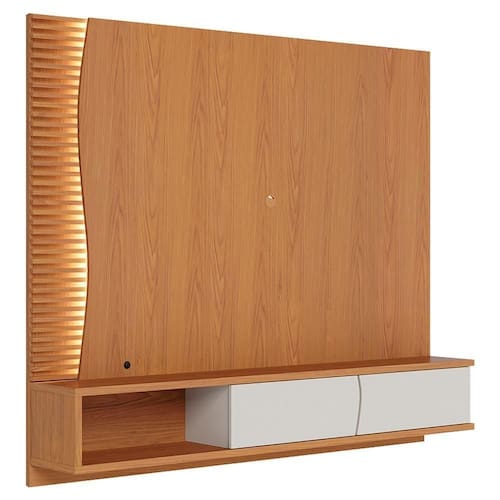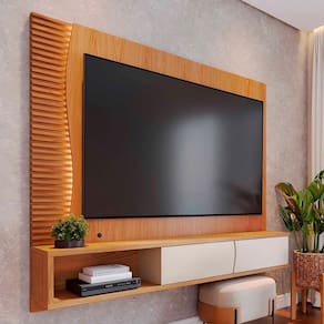 Painel Suspenso Egeu, combina design sofisticado e funcionalidade para transformar sua sala. Estrutura em MDP/MDF (25, 15 e 12 mm), conta com acabamento em pintura UV texturizada. Possui 2 portas com detalhe curvado, lateral com detalhe ripado(alto relevo) com luminária LED e passa fios incluso. Suporta TVs de até 65 polegadas com segurança. Este produto será entregue em 2 volumes.