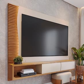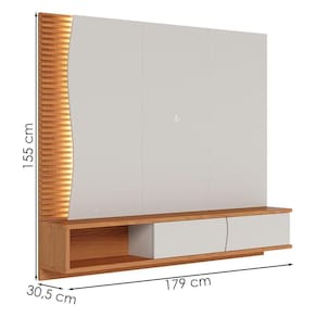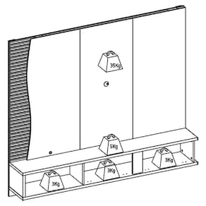 Painel Suspenso Egeu, combina design sofisticado e funcionalidade para transformar sua sala. Estrutura em MDP/MDF (25, 15 e 12 mm), conta com acabamento em pintura UV texturizada. Possui 2 portas com detalhe curvado, lateral com detalhe ripado(alto relevo) com luminária LED e passa fios incluso. Suporta TVs de até 65 polegadas com segurança. Este produto será entregue em 2 volumes.