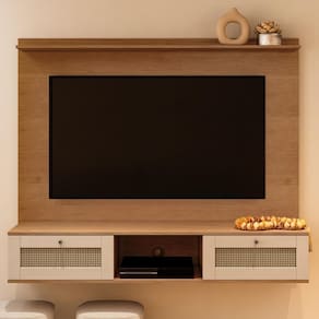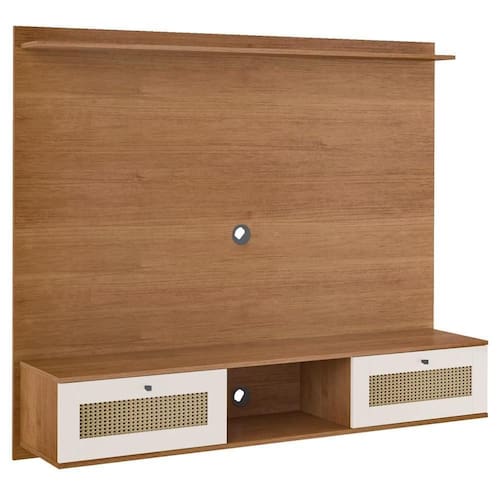 Características adicionais: Para TVs de até 72 polegadas; Possui 2 passa fios; Acompanha suporte para TV. Amplo espaço para decorações e eletrônicos; 2 portas basculantes com amortecedor e dobradiças metálicas; 1 prateleira superior e 1 Nicho; Pintura 3D no acabamento ripado.