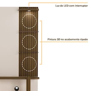 Características adicionais: Para para TV até 72 polegadas; Possui 2 passa fios; Acompanha suporte metálico para TV, 4 prateleiras de vidro temperado 6mm. Luz de LED com 2m de fio para ligar na tomada; 2 portas com dobradiças metálicas; Detalhes curvos de MDF 25mm e 15mm; Pintura 3D no acabamento ripado.