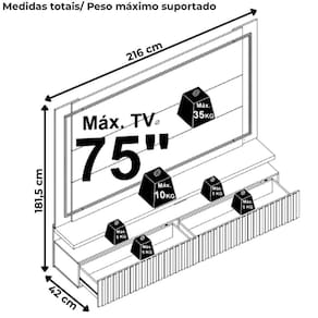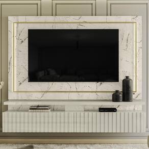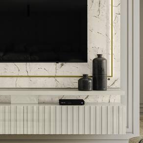 Painel Suspenso Gaia, com design sofisticado e elementos funcionais que valorizam sua sala. Produzido em MDP 15/25/40 mm (base 15/25 mm e tampo 40 mm), ideal para TVs de até 75 polegadas (suporta até 65 kg distribuídos). Conta com 2 gavetas com frente ripada em alto relevo e corrediças telescópicas, 1 prateleira inferior, moldura metálica dourada e 2 fitas de LED embutidas. Possui passa-fios central e inferior. Acabamento em pintura UV texturizada (fosca e brilho). Este móvel será entregue em 03 volumes.