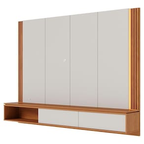 Painel Suspenso Loa, combina design moderno e funcionalidade para transformar sua sala. Estrutura em MDF/MDP (25, 15 e 12 mm) com acabamento em pintura UV texturizada. Composto por portas de correr, tampo chanfrado, painel sobreposto e laterais ripadas com luminárias LED, além do passa fios embutido. Suporta TVs de até 75 polegadas com segurança. Este produto será entregue em 3 volumes.