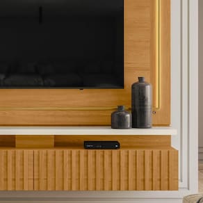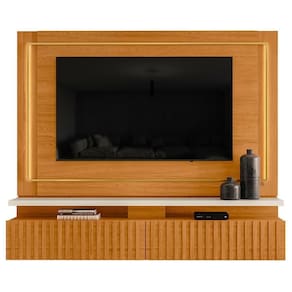 Painel Suspenso Gaia, com design sofisticado e elementos funcionais que valorizam sua sala. Produzido em MDP 15/25/40 mm (base 15/25 mm e tampo 40 mm), ideal para TVs de até 75 polegadas (suporta até 65 kg distribuídos). Conta com 2 gavetas com frente ripada em alto relevo e corrediças telescópicas, 1 prateleira inferior, moldura metálica dourada e 2 fitas de LED embutidas. Possui passa-fios central e inferior. Acabamento em pintura UV texturizada (fosca e brilho). Este móvel será entregue em 03 volumes.