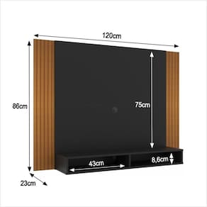 Ambiente Principal: Sala de Estar | Largura: 120 cm | Complexidade da Montagem: Média | Pessoas necessárias para montagem: 1 | Altura: 86 cm | Profundidade: 23 cm | Suporta até: 30 kg | Possui iluminação Não | Medida máxima para TV: 43 polegadas | Origem do produto Nacional | Necessita montagem: Sim | Possui portas: Não Possui Portas | Possui gavetas: Não Possui Gavetas | Quantidade de caixas de embalagem: 1 | Possui prateleiras?: Não Possui Prateleiras | Possui nichos?: Possui 2 nichos | Possui espelhos?: Não Possui Espelhos | Possui vidro?: Não Possui Vidro | Modelo Bonsai; Estante; Painel; Sala de Estar; Quarto; Royal; | Marca: ViaNossa; ViaNossa Móveis; EDN Móveis; Bonsai; Royal | Material: MDP e MDF | Formato do móvel: Painel | Acabamento Pintura UV | Tempo de garantia: 3 meses | Tipo de garantia: Fabricante | Inclui manual de montagem: Sim Preto e Ripado