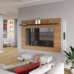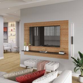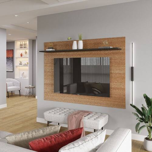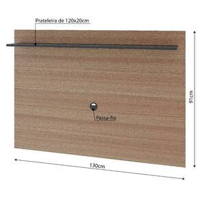 A prateleira espaçosa e o nicho discreto acomodam seus aparelhos eletrônicos, DVDs, livros e objetos decorativos, mantendo tudo à mão e organizado. O sistema passa fios integrado garante um visual clean e livre de emaranhados, proporcionando um ambiente harmonioso e livre de distrações visuais.