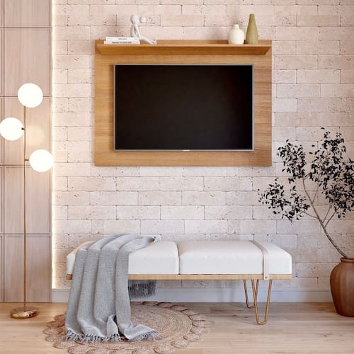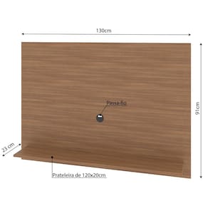 A prateleira espaçosa e o nicho discreto acomodam seus aparelhos eletrônicos, DVDs, livros e objetos decorativos, mantendo tudo à mão e organizado. O sistema passa fios integrado garante um visual clean e livre de emaranhados, proporcionando um ambiente harmonioso e livre de distrações visuais.