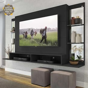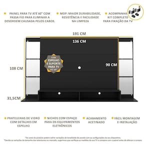 Prático e moderno para deixar sua sala de estar confortável para aproveitar o aconchego do seu lar. O Painel TV até 60 polegadas com suporte, espelho e prateleiras vidro Nairóbi Multimóveis é uma escolha inteligente e super em conta para deixar o seu ambiente bonito e organizado. Produzido em MDP com acabamento acetinado, que garante maior durabilidade, resistência e facilidade na limpeza, possui painel para TV de até 60" com espaçamento para a passagem dos fios, o que deixa um visual clean e os cabos organizados. Possui 4 prateleiras em vidro, com detalhes em espelho, que deixam o móvel mais requintado e 2 nichos para acomodar os equipamentos eletrônicos. Os espelhos são de vidro (o que evita que a imagem fique distorcida) e lapidados, ou seja, passam por um processo para que as bordas não fiquem cortantes, o que garante maior segurança. Para facilitar a sua vida, este produto acompanha também o kit para fixação da TV. Muito prático e de fácil instalação, pode ser utilizado para TVs LCD, LED e plasma de 14 a 71". Totalmente sobreposto, acompanha gabarito de montagem que auxilia na instalação. Conta com um sistema de encaixe rápido, possui 16mm de deslocamento que permite o ajuste do encaixe das peças.
