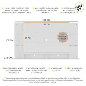Dimensões do produto montado: Altura: 108 cm | Largura: 191 cm | Profundidade: 31,5 cm Tamanho Painel TV: 136 x 90cm *Devido as variações de tamanho dos televisores no mercado, sugerimos que verifique as medidas da sua TV e compare com o painel antes de efetuar a compra. *Não recomendamos utilizar suporte de TV articulado. *Você pode consultar as medidas internas na imagem técnica do produto.