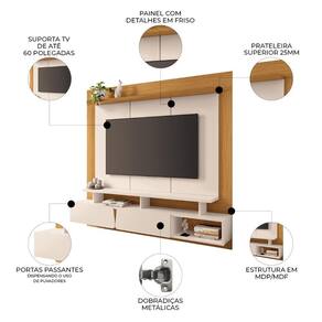 Características do Produto Material da Estrutura: MDP/MDF. Espessura das Chapas: 15mm/25mm. Acabamento: Pintura UV. Escala de Brilho: Fosco/Brilho. Peso Suportado: 40 kg Distribuídos. Suporta TV de até: 60 Polegadas. Quantidade de Portas: 2 Portas. Tipo de Porta: Convencional. Material das Dobradiças: Metal. Quantidade de Prateleiras: 2 Prateleiras. Quantidade de Nichos: 3 Nichos. Possui LED: Não. Diferenciais: - Design moderno. - Portas passantes, dispensa uso de puxador. - Painel com detalhes em friso. - Prateleira superior e tampo 25mm. Sistema de Montagem: Parafusos/Cavilhas. Manual de Montagem: Sim. Complexidade da Montagem: Média. Volumes: 2 Volumes. Conteúdo da Embalagem: 1 Painel Suspenso. Garantia do Fabricante: 90 dias contra defeito de fabricação. Montagem: Recomendamos que seja feita por um profissional. Recomendação de Limpeza: Utilize pano levemente úmido.