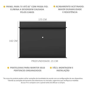 Dimensões do produto montado: Altura: 142cm | Largura: 175cm | Profundidade: 21cm *Devido as variações de tamanho dos televisores no mercado, sugerimos que verifique as medidas da sua TV e compare com o painel antes de efetuar a compra. *Não recomendamos utilizar suporte de TV articulado. *Você pode consultar as medidas internas na imagem técnica do produto.