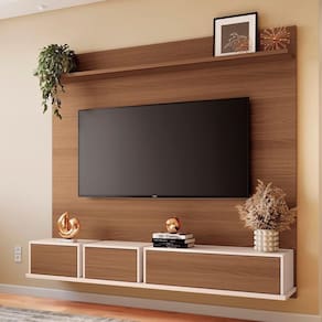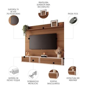 Ideal para TVs de até 70 polegadas, o Painel Para TV permite que o aparelho seja fixado diretamente, proporcionando um visual sofisticado e um aproveitamento de espaço eficiente. A combinação de linhas retas com acabamentos minimalistas garante um toque elegante e funcional ao ambiente. O Painel Suspenso é equipado com três portas basculantes, que possuem dobradiças metálicas e sistema de abertura por fecho toque, garantindo praticidade e um design sem puxadores visíveis. As portas basculantes adicionam um toque de modernidade, sem abrir mão da funcionalidade e praticidade no dia a dia. Além disso, a prateleira superior de 25mm foi projetada para acomodar decorações e outros itens. Fabricado em MDP e MDF, de 25mm e 15mm, garantindo robustez, estabilidade e durabilidade. A escolha perfeita para quem busca aliar design moderno, funcionalidade e resistência em um único produto.