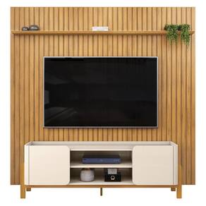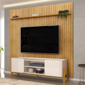 O Painel Ripado feito em MDF e acabamento em pintura UV, ele combina durabilidade. A prateleira, com borda chanfrada, é ideal para exibir objetos decorativos, enquanto o Painel suporta TVs de até 75 polegadas, assegura segurança e estilo ao ambiente. O sistema de passa-fios integrado mantém os cabos organizados e fora de vista, proporcionando um visual elegante. O Rack Bancada, com design moderno, acomoda TVs de até 65 polegadas e oferece funcionalidade com charme. Seu tampo espaçoso, com cantos curvos e recuados, é complementado por cantoneiras arredondadas e duas portas elegantes, que proporcionam organização eficiente. O nicho central amplo, com prateleira, é perfeito para eletrônicos, enquanto os pés em madeira maciça garantem robustez e sofisticação. Além disso, os pés elevados facilitam a limpeza, e o passa-fios integrado mantém a estética impecável.