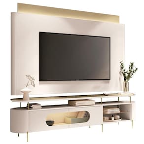 O painel possui bordas laterais arredondadas e iluminação LED embutida na parte superior, criando um efeito de luz indireta que valoriza o ambiente com suavidade e charme. Sua estrutura suporta televisores de até 85 polegadas com segurança e estilo.
