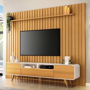 Características do Produto Material da estrutura: MDP/MDF 15mm. Acabamento: Pintura UV. Escala de Brilho: Brilhante/Fosco. Peso Suportado: 50 kg no Rack, 50 kg no Painel, ambos distribuídos. Suporta TV de até: 85 Polegadas. Quantidade de Portas: 3 Portas. Tipo de Porta: 2 Convencional/1 Basculante. Tipo de Dobradiças: Metálicas/Pistão a gás. Possui Puxador: Não. Possui Gavetas: Não. Quantidade de Nicho: 2 Nichos. Quantidade de Prateleiras: 1 Prateleira. Possui LED: Não. Possui Pés: Sim. Material dos Pés: Madeira Maciça. Possui Passa Fios: Sim. Diferenciais: - Design clean e moderno, com cantos arredondados. - Porta central com pistão a gás - Portas com abertura fecho toque e filetes decorativos em tom dourado. Sistema de Montagem: Parafusos/Cavilhas/Minifix. Manual de Montagem: Sim. Complexidade da Montagem: Média. Volumes: 4 Volumes. Conteúdo da Embalagem: 1 Rack Bancada, 1 Painel Ripado. Garantia do Fabricante: 90 dias contra defeito de fabricação. Montagem: Recomendamos que seja feita por um profissional. Recomendação de Limpeza: Utilize pano levemente úmido.