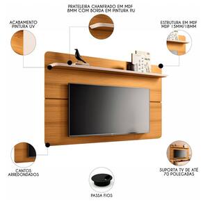 Características do Produto Material da estrutura: MDF/MDP 15mm e 18mm. Acabamento: Pintura UV. Escala de Brilho: Fosco/Brilhante. Peso Suportado: 40 kg distribuídos. Suporta TV de até: 70 Polegadas. Quantidade de Prateleiras: 1 Prateleira. Possui LED: Não. Possui Passa Fios: Sim. Diferenciais: - Design orgânico. - Prateleira chanfrado em MDF 18mm com borda em pintura P.U. - Cantos arredondados. Sistema de Montagem: Parafusos/Cavilhas/Minifix. Manual de Montagem: Sim. Complexidade da Montagem: Baixa. Volumes: 1 Volume. Conteúdo da Embalagem: 1 Painel para TV. Garantia do Fabricante: 90 dias contra defeito de fabricação. Montagem: Recomendamos que seja feita por um profissional. Recomendação de Limpeza: Utilize pano levemente úmido.
