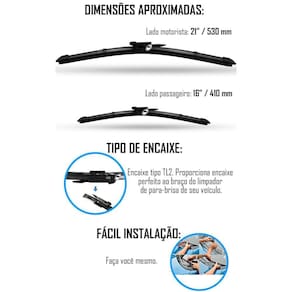 2. Qual é o tamanho das palhetas? - O lado do motorista possui 21 polegadas 530mm e o lado do passageiro possui 16 polegadas 410mm .