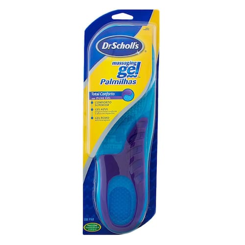 PALMILHA DR SCHOLLS MASSAGING GEL MASCULINA Com linhas de corte para ajuste perfeito ao tamanho do seu pé. Palmilha de gel azul transparente com cobertura suave de tecido. Versão masculina (40 a 45).