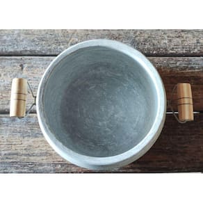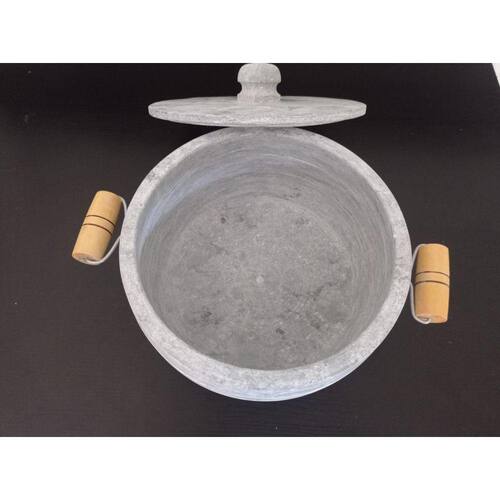 Ø Medidas Número 5 (5 litros aproximadamente) MaterialØ Pedra sabãoØ Alças em madeira Observação:* A panela precisa ser curada, processo este que é feito apenas uma vez, juntamente com a mercadoria irá um folheto explicativo. * Todo material em pedra sabão-após curado muda de cor ficando com uma tonalidade mais escura.* Fotos ilustrativas. Por ser artesanal as peças podem ter variações
