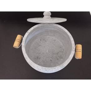 Ø Medidas Número 7 (7 litros aproximadamente) MaterialØ Pedra sabãoØ Alças em madeira Observação:* A panela precisa ser curada, processo este que é feito apenas uma vez, juntamente com a mercadoria irá um folheto explicativo. * Todo material em pedra sabão-após curado muda de cor ficando com uma tonalidade mais escura.* Fotos ilustrativas. Por ser artesanal as peças podem ter variações