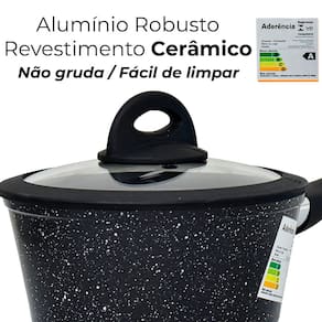 A Panela Viena possui 2,5mm de espessura, o que melhora o preparo de seus alimentos, pois a temperatura é dissipada de maneira uniforme e favorece o cozimento, evitando que sua comida queime facilmente. É indicada para todos fogões, sejam eles a gás, indução, vitro-cerâmico ou elétrico. A Panela é feita em alumínio com revestimento cerâmico na cor preta esmaltada e granilites brancos, com classificação A do Inmetro, não gruda, é mais fácil de limpar e mais saudável, pois necessita de menos óleo para o cozimento e é livre de metais pesados. Possui cabos com acabamento siliconado Soft-Touch na cor preta, que dá um toque macio e não esquenta, evitando acidentes. A tampa também possui bordas em silicone preto, é feita de vidro temperado com saídas para vapor em inox, trazendo um design inovador, ideal para você que gosta de sofisticação e elegância em sua cozinha.